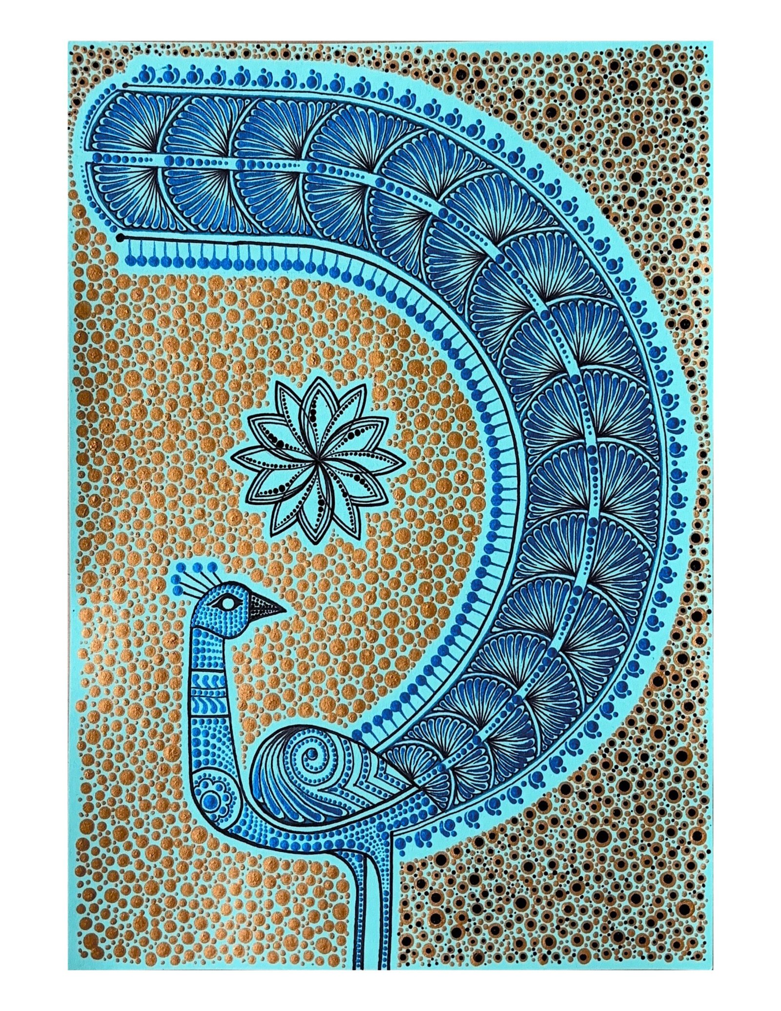 This original artwork features a beautifully stylized peacock illustrated with intricate linework, mandala motifs, and flowing geometric elements. The rich blue detailing contrasts against a textured field of warm gold infinite dots, creating depth, movement, and visual balance. The blend of traditional influences with modern abstraction makes this piece a striking and elegant statement for any art lover’s space. Hand-painted with precision and care by the artist.